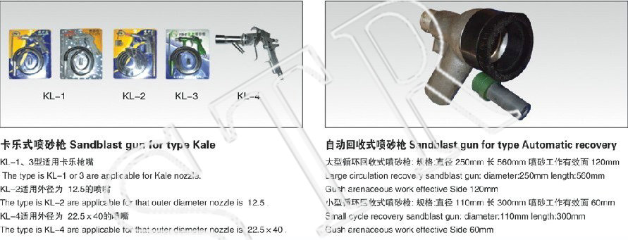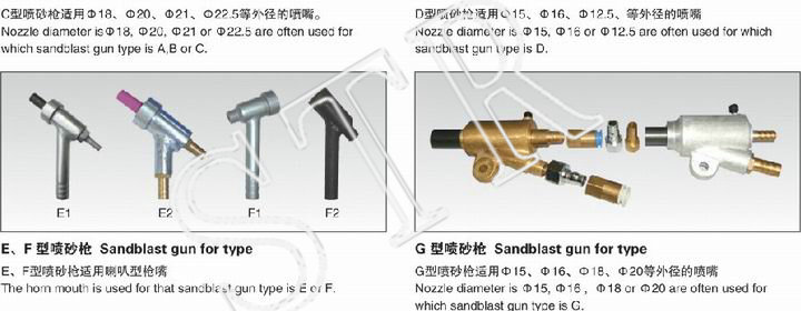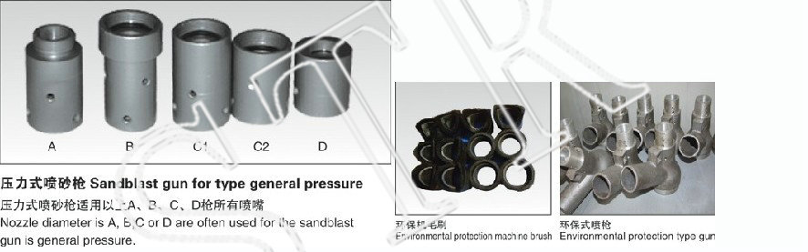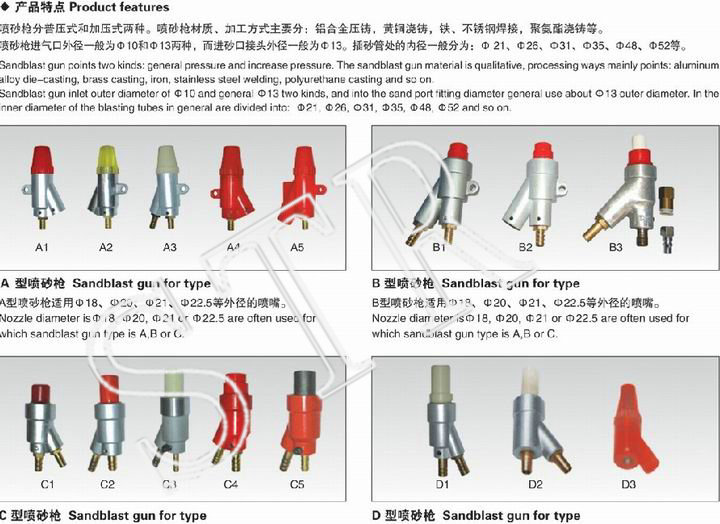噴砂槍分普壓式和后加壓式兩種類型。噴砂槍木頭材質、代加工具體方法基本分:鋁各種合金壓鑄,銅合金澆鑄,鐵、不銹鋼板電弧焊接,橡膠澆鑄等。