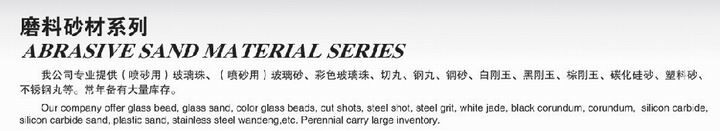我公司供應(噴(pen)砂(sha)(sha)(sha)用(yong))破璃(li)珠(zhu)、(噴(pen)砂(sha)(sha)(sha)用(yong))破璃(li)砂(sha)(sha)(sha)、多(duo)彩(cai)破璃(li)珠(zhu)、切丸(wan)(wan)、鋼丸(wan)(wan)、鋼砂(sha)(sha)(sha)、白(bai)剛(gang)玉、黑剛(gang)玉、棕剛(gang)玉、炭(tan)化硅(gui)砂(sha)(sha)(sha)、朔膠砂(sha)(sha)(sha)、304不銹鋼丸(wan)(wan)等。一年(nian)四季常備(bei)不少貨存。