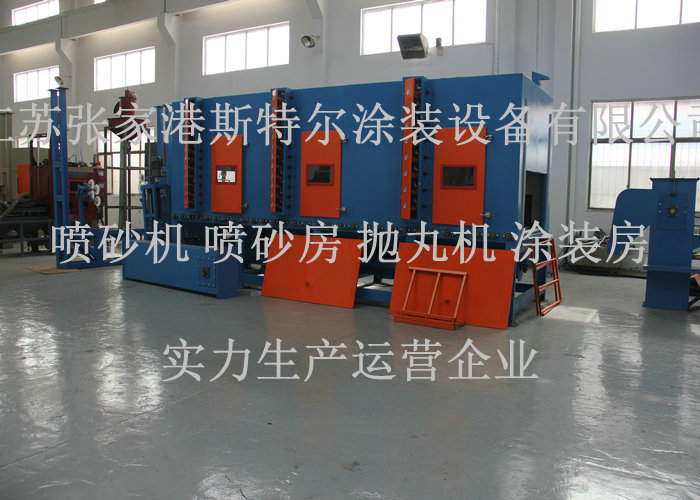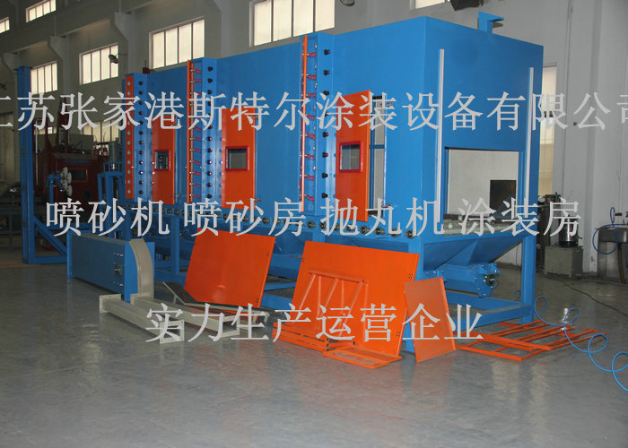 方形坩堝產品內壁處理要求而專門設計的專用型輸送式自動噴砂機,適合需求公司所提供的產品。根據需求公司對產品效率的要求,本機設置一套自動輸送線,共分五段線體。噴砂艙內共設三個噴砂位,工件通過輸送線體帶動步進方式分別在三個噴砂位進行噴砂加工清理,噴砂區域內共布置20支普壓高速噴砂咀,在噴砂區第一個噴砂位布置8支噴咀噴工件內底面,在噴砂區第二個噴砂位布置6支噴咀噴工件內前后側面,在噴砂區第三個噴砂位布置6支噴咀噴工件內左右側面,噴咀可根據加工需要,適當調整其噴射角度,其自動化程度較高。每個工件需間歇進行三次噴砂清理加工,才能完成整個內表面的清理。在出口處設有翻轉機構,用于傾倒內部的砂料,該動作自動完成,無需人工操作。 噴砂工序過程