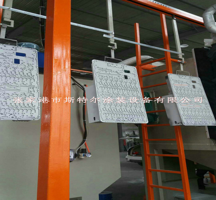 江蘇某企業在我司定制的懸掛鏈自動噴砂機具有以下幾個特點食品:具體是華為麥芒5G 基站天線鋁殼板。